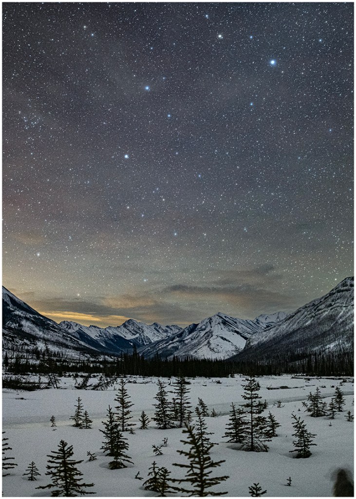 Last night, I went looking for stars and peace. It was after midnight but before the moon was up. I could hear the creek flowing under the ice. The mountains were in outline, and the familiar constellations were holding their own.