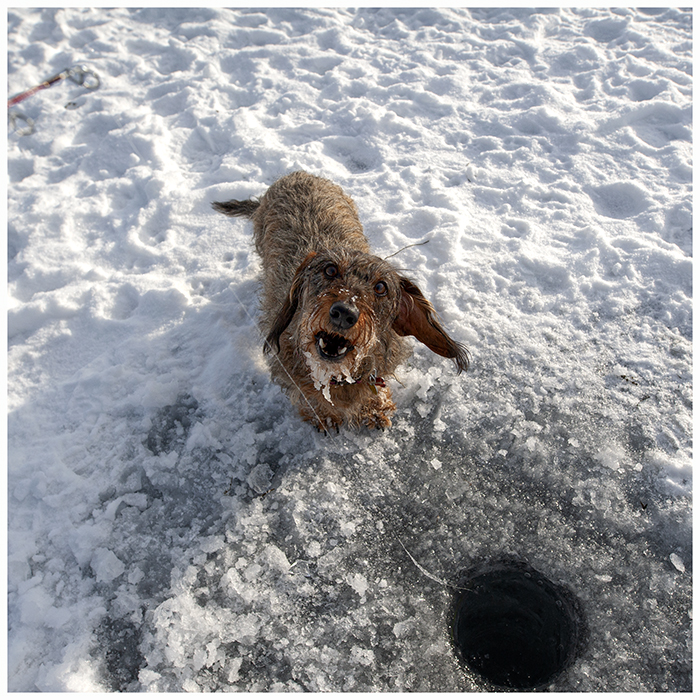 Still, it was refreshing enjoying the lake. Jake drilled his own hole in the almost 2 feet of thick ice. The dogs ran this way and that. Very fine day.