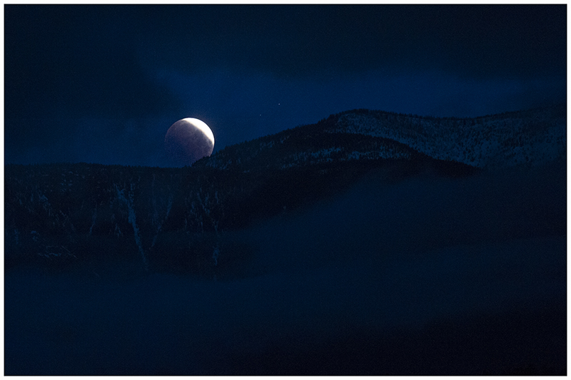 Plenty of rain lately. I didn’t hold out much hope for seeing this mornings lunar eclipse. Still, what’s the harm in trying. You don’t catch any fish without putting the line in the water. Willow and I were up early and headed for a high piece of ground, knowing the moon would be close to the western horizon. We caught a glimpse in a crack in the clouds just before the moon went down.
