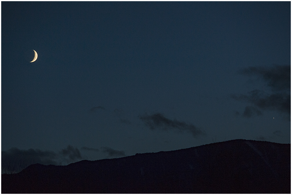 It’s tough to believe in anything I hear during lunch or on the phone. Venus appeared on the ridge tonight after a few days of cloud. A waxing crescent moon to the left and above. I had to think about it, but they were right on time and in position.