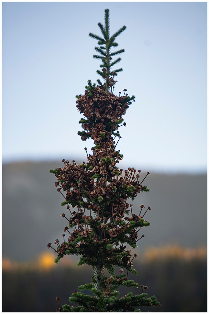Hi Carol, good eyes. It is a spruce tree. Very mush like a fir tree. This has been a good year for cones. The birds will be happy in the winter. they break the cones for the seed inside. The cones in the photo had flowered. The ‘fungi’ is dried flowers. Flowering is unusual as well and doesn’t happen every year.