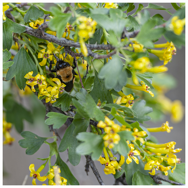 The pictures here are of a bee I’ve never seen before. The first thing I noticed was it’s size. It is the size of about a quarter. It seems to defy physics with it’s small wings allowing flight. The second thing you notice is it’s long beak that it sticks inside the flower to suck out the nectar, kind of like a hummingbird. A matter of fact, the other day, a hummingbird was doing the same in the gooseberry bushes, along side one of these giant, and there wasn’t much of a size difference