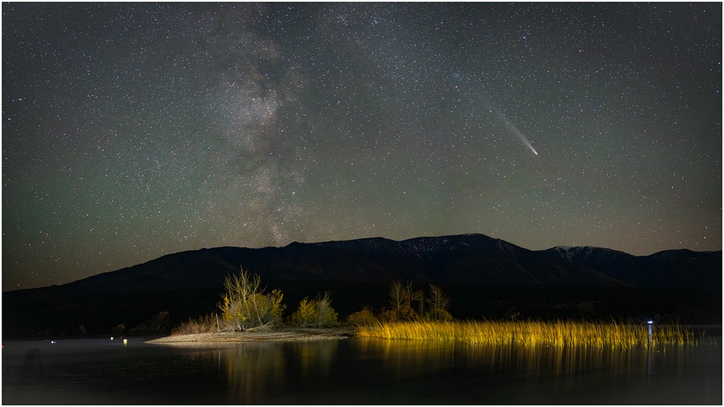 The full moon illuminated the mountainside. Only the brightest stars could be seen. Of course, the moon also washed away the comet. Still I had faith and pointed the camera in the general direction of where it should be.