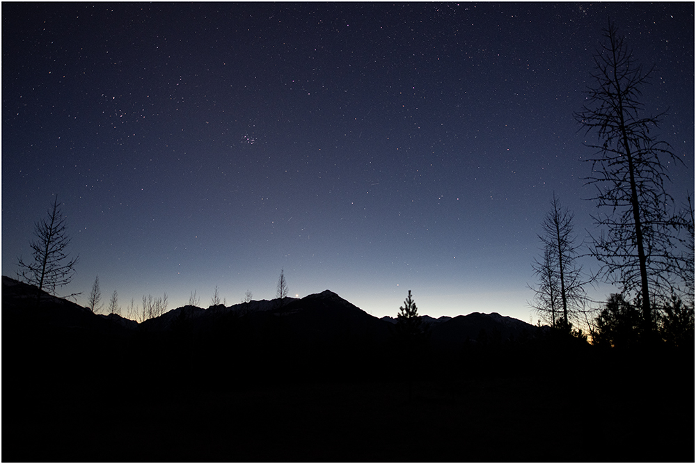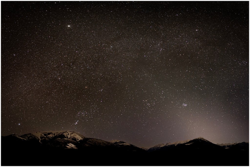Watched the sun set and waited to see if the zodiacal light would appear. Orion is in the east close to setting at dusk. It will be washed out by light soon, only to reappear to signal the coming fall. Venus was bright right on the western horizon. Jupiter was above Orion and Gemini ruling the sky. Sure enough a triangular white glow appeared with Pleiades caught in the light. Very fine spring day.