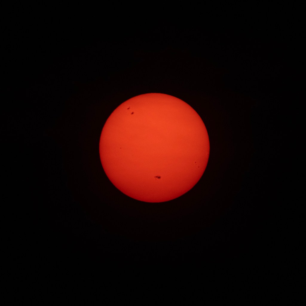 The sun came up red and set red. High in the sky it was a strange yellow that cast even hot light. I snapped the photo above a few minutes ago, hoping I would capture the sunspots. Smoke is an odd filter to use to photograph the sun, but it works.