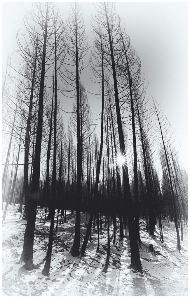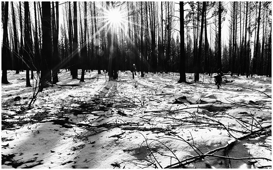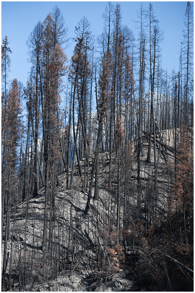 The edge of the fire. The orange colour is scorched fir needles yet to fall. It wouldn’t be hard finding ghosts roaming these woods.