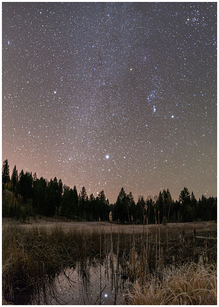 Pleiades, Taurus, Gemini, Orion and the hunter’s fierce dog Siris shining through the clouds. The mountain and landscape is illuminated from the valley’s man-made light bouncing off the clouds.