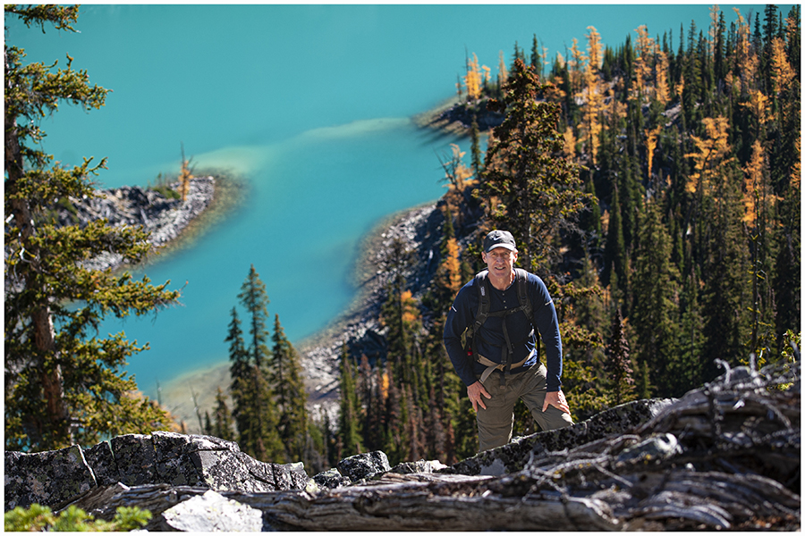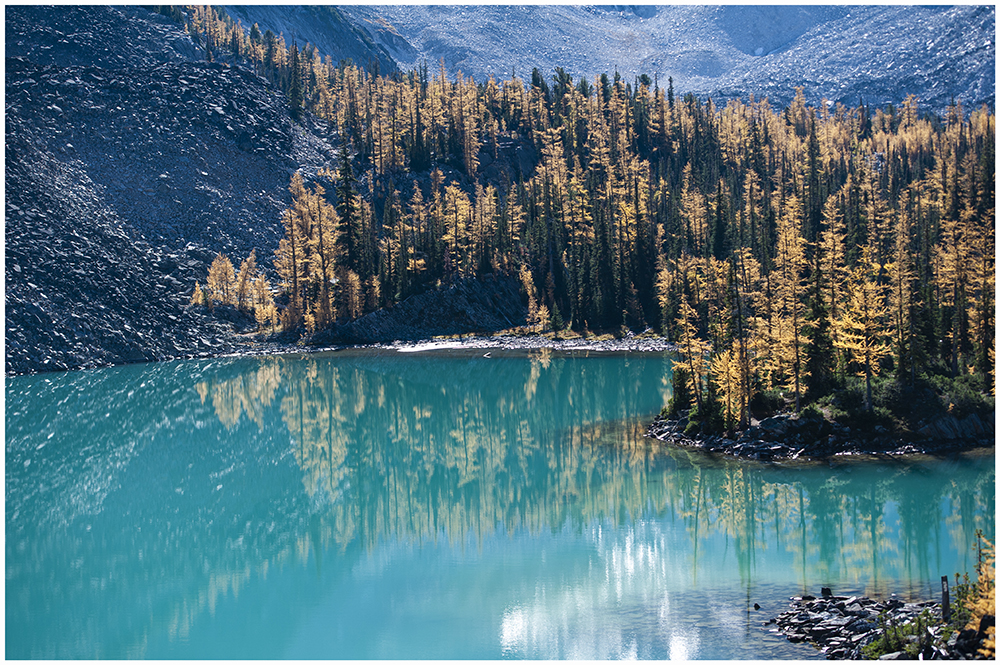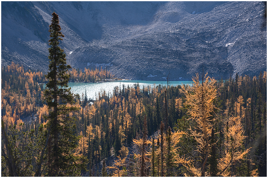 The sun was directly above, lighting the turning tamaracks. It’s a perfect world when the gold is opposite the blue green mountain lakes. That was the last I had my camera out as we were heading down. I thought we must be late for something.