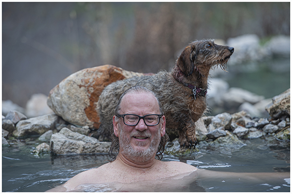 Damn near fifty years between soaks. Willow balances on some rocks refusing to get wet.