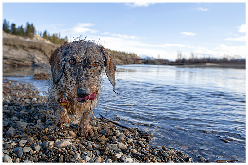 Willow looking a little like a wild animal. I see her smiling. In fact she is chewing the stick she fetched between her paws.